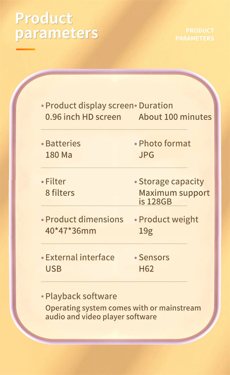 Key Features: - High-definition 1080P video and photo capture allows you to document your experiences in vivid detail. - Equipped with a built-in 200mAh battery, the camcorder offers 2-3 hours of continuous usage on a single charge, ensuring you won’t miss a moment. - Supports loop recording and is compatible with MicroSD/TF cards ranging from 8GB to 512GB. This means that once your storage is full, the camcorder will automatically overwrite the oldest files, giving you peace of mind. - A convenient display screen allows you to review your photos and videos instantly, ensuring you're just a click away from replaying your favorite shots. - The user-friendly one-button video recording feature makes it incredibly easy to operate, perfect for users of all ages. Lightweight and compact, it's an ideal gift for children and friends alike, and is suitable for a range of activities including school outings, hiking, cycling, and more.